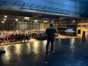 Francisco Ackermann, autor del best seller “Con Peras y Finanzas”; además de inversionista y creador de contenido santiaguino se presentó ante casi 500 asistentes, gracias a la coordinación de la Municipalidad de Pucón, Enjoy y la Fundación Humanos por la Tierra.
