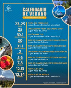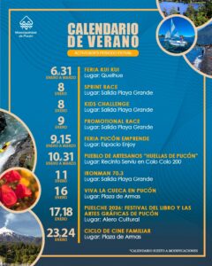 El personero detalló que, además, “tenemos una ruta que se llama la Ruta del Campo Vivo, que son todas las expos rurales que tendremos, alrededor de siete, que van a estar en diferentes sectores. También tenemos todas las actividades en el marco de las fiestas familiares de Pucón de este verano, que serán en el Parque Deportivo Municipal, donde encontrarán cocinería, foodtruck, diversión y juegos típicos. También tendremos shows artísticos acompañados de algunos concursos, así que estará muy atractivo”.