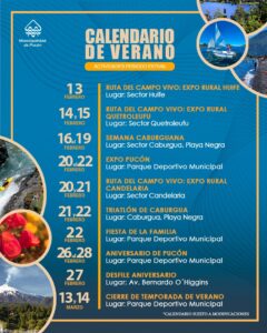 Durante esta temporada estival 2026 Pucón se caracterizará por siete Expo Rurales, dos ferias del proyecto Pucón Emprende -al lado de la Plaza de Armas, en el estacionamiento Enjoy-, ocho festivales y otras cuatro actividades; entre ellas, el triatlón de Caburgua, la Fiesta de la Familia y, la más próxima que es la Fiesta del Parrillero, a realizarse entre el 23 y el 25 de enero venidero.
