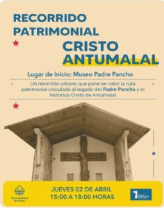 Recorrido Patrimonial Cristo Antumalal se denomina la experiencia a la cual está invitando la Municipalidad de Pucón, este jueves 2 de abril a partir de las 15 horas y hasta aproximadamente 6 de la tarde, desde el Museo del “Padre Pancho”, junto a la Plaza de Armas de la urbe lacustre, con paso por diferentes puntos de valor cultural y no sólo religioso.