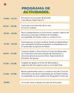 La actividad, en el marco de Semana Santa la está organizando el Municipio de Pucón, a través de su Departamento de Turismo, junto a la Fundación del Padre Pancho, desde donde buscan conectar memoria, territorio y comunidad, detrás de las huellas dejadas, indelebles, del sacerdote Francisco Valdés Subercaseaux, el reconocido “Padre Pancho”, gestor y autor del simbólico Cristo de Antumalal.
